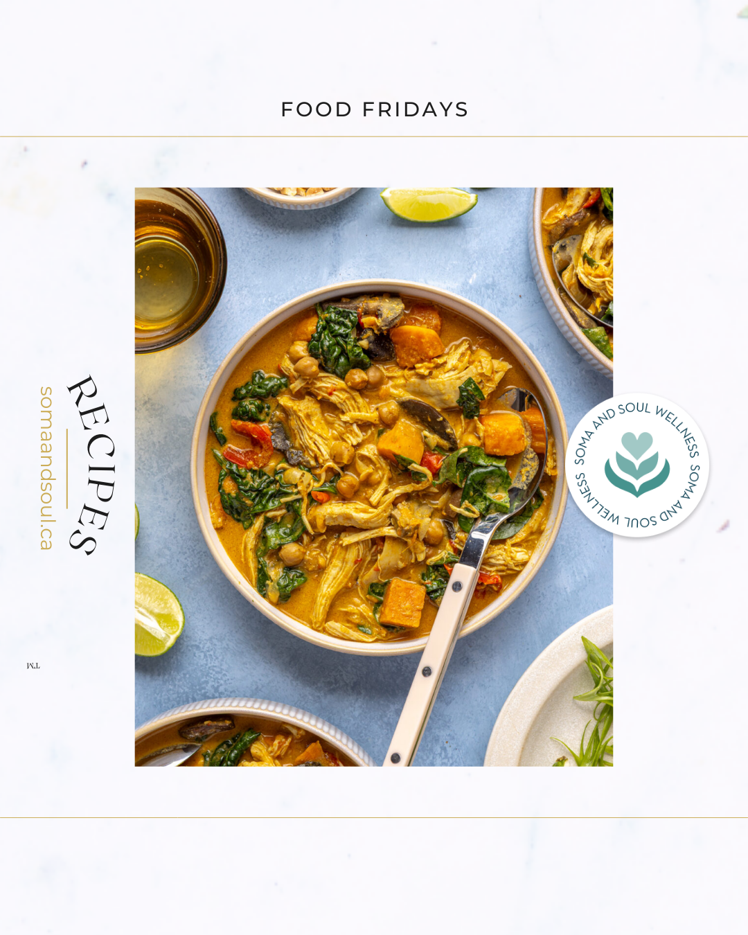 With cooler weather moving in, an easy, warm, no-fuss meal is exactly what we want. This Freezer-Friendly Coconut Curry Chicken Stew checks all the boxes. It’s built on protein-packed chicken and chickpeas, fibre-rich vegetables like sweet potato, mushrooms, and spinach, and a creamy coconut-milk base for a balanced, satisfying bowl.