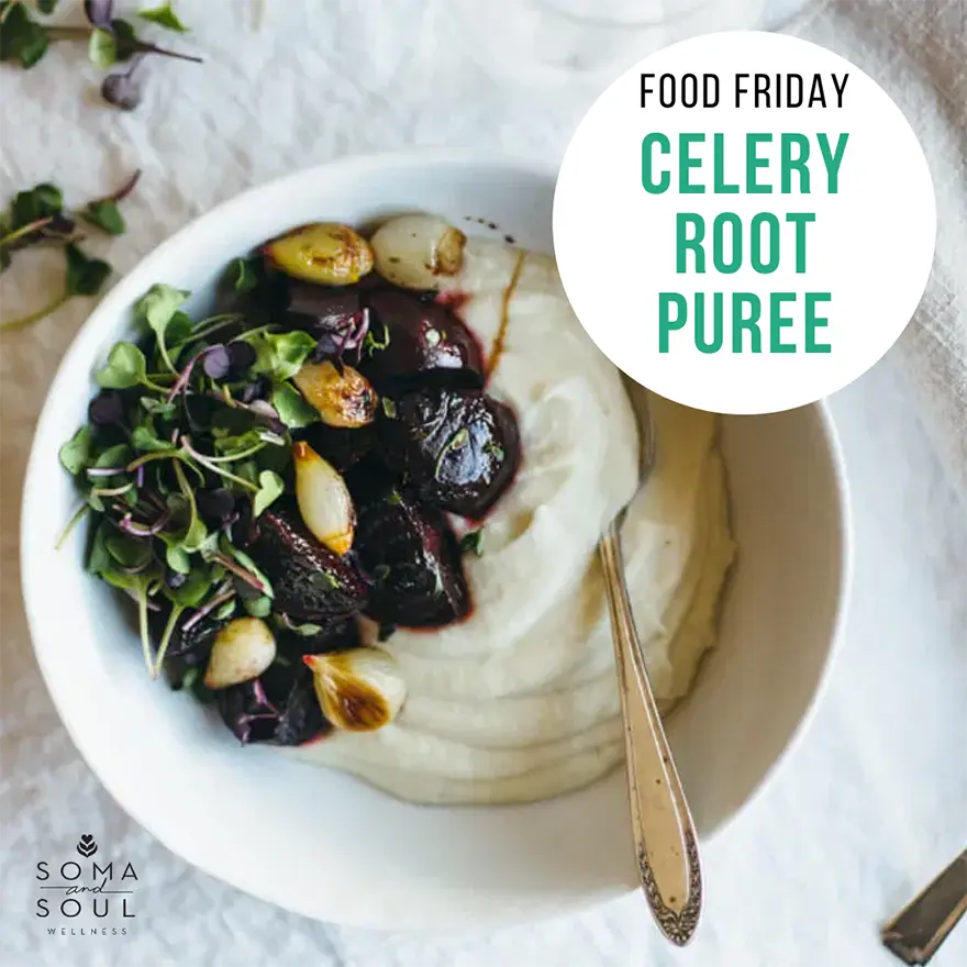 - Serve by scooping a portion of the celery root puree into a bowl and topping with roasted beets, pearl onions and a handful of microgreens.