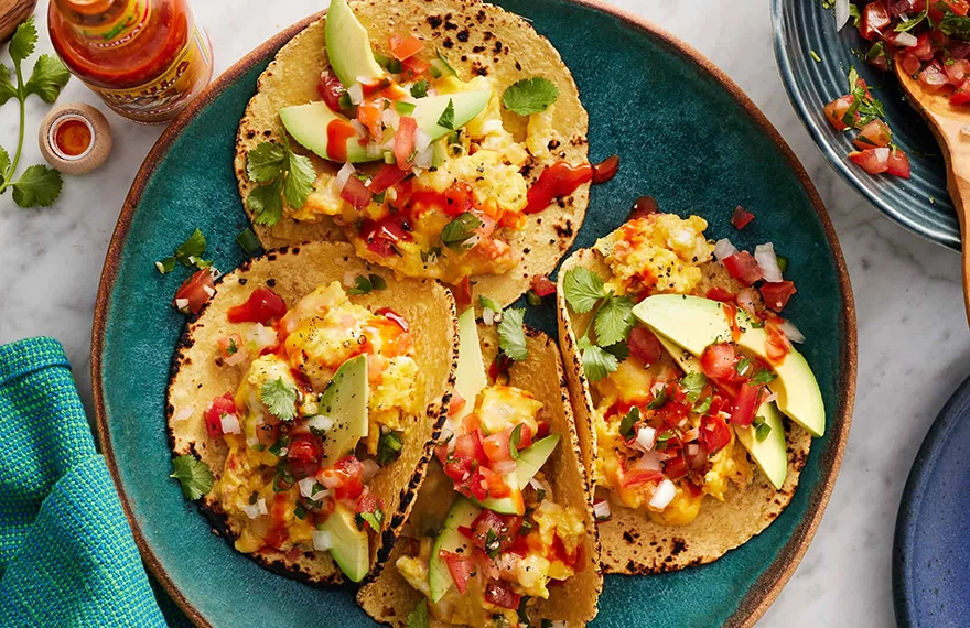 - To assemble breakfast tacos, divide the eggs and avocado slices among the tortillas. Top with the remaining pico de gallo and cilantro. Serve with hot sauce.