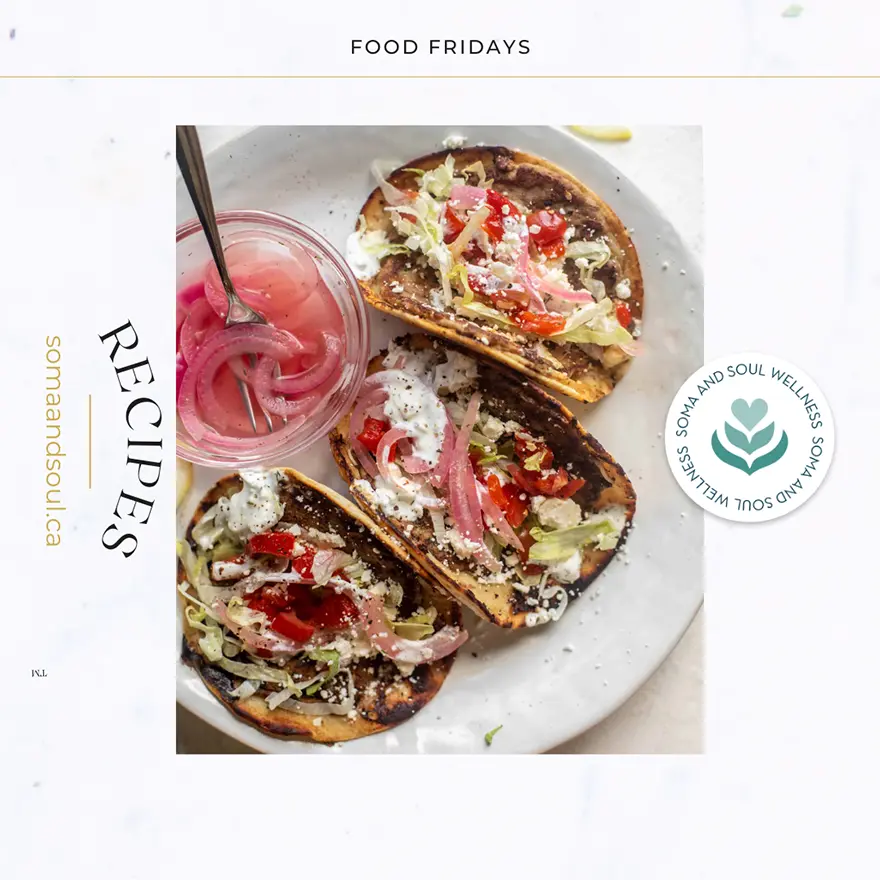 - Remove the tortilla from the skillet and immediately top it with chopped tomatoes, roasted red peppers and shredded lettuce. Top with pickled onions and the yogurt feta sauce. Fold it up like a taco and enjoy!